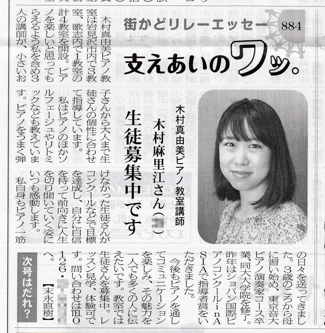 さて、地元新聞「プレス空知」、街かどリレーエッセー「支えあいのワッ。」というコーナーがあるのですが、本日発行のそのコーナーに麻里江先生が登場しました♪前回に登場しました方が、いつも教室発表会でOG出演してくださってます絵理ちゃんのお母様だったのですが、次、麻里江先生を紹介されたらしく、先日、プレス空知の記者さんから電話が来まして、一昨日、取材に来られて本日掲載となりました。